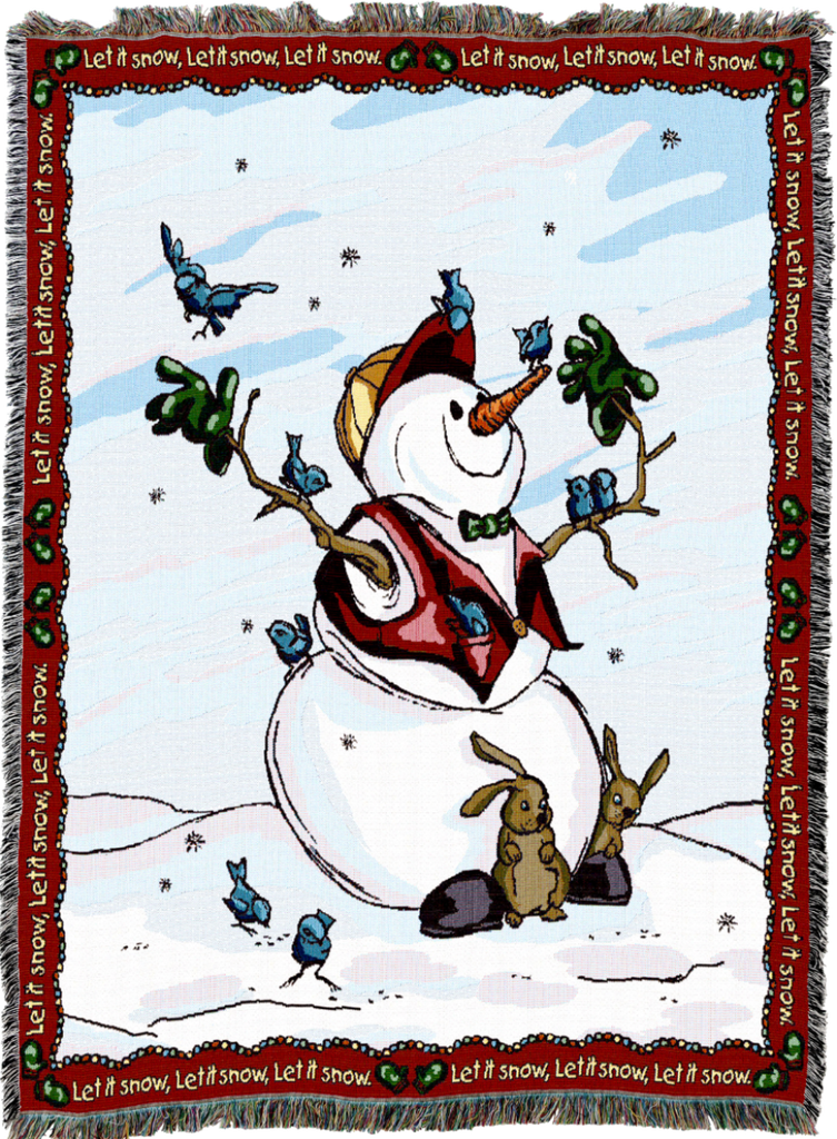 Adorable Snowman, Birds, and Bunnies enjoying the snow. Handcrafted from skilled artisan weavers in USA textile mills on Jacquard Looms. These 100% cotton, Oeko-tex Certifie throw blankets make perfect gifts and welcome additions to any home.